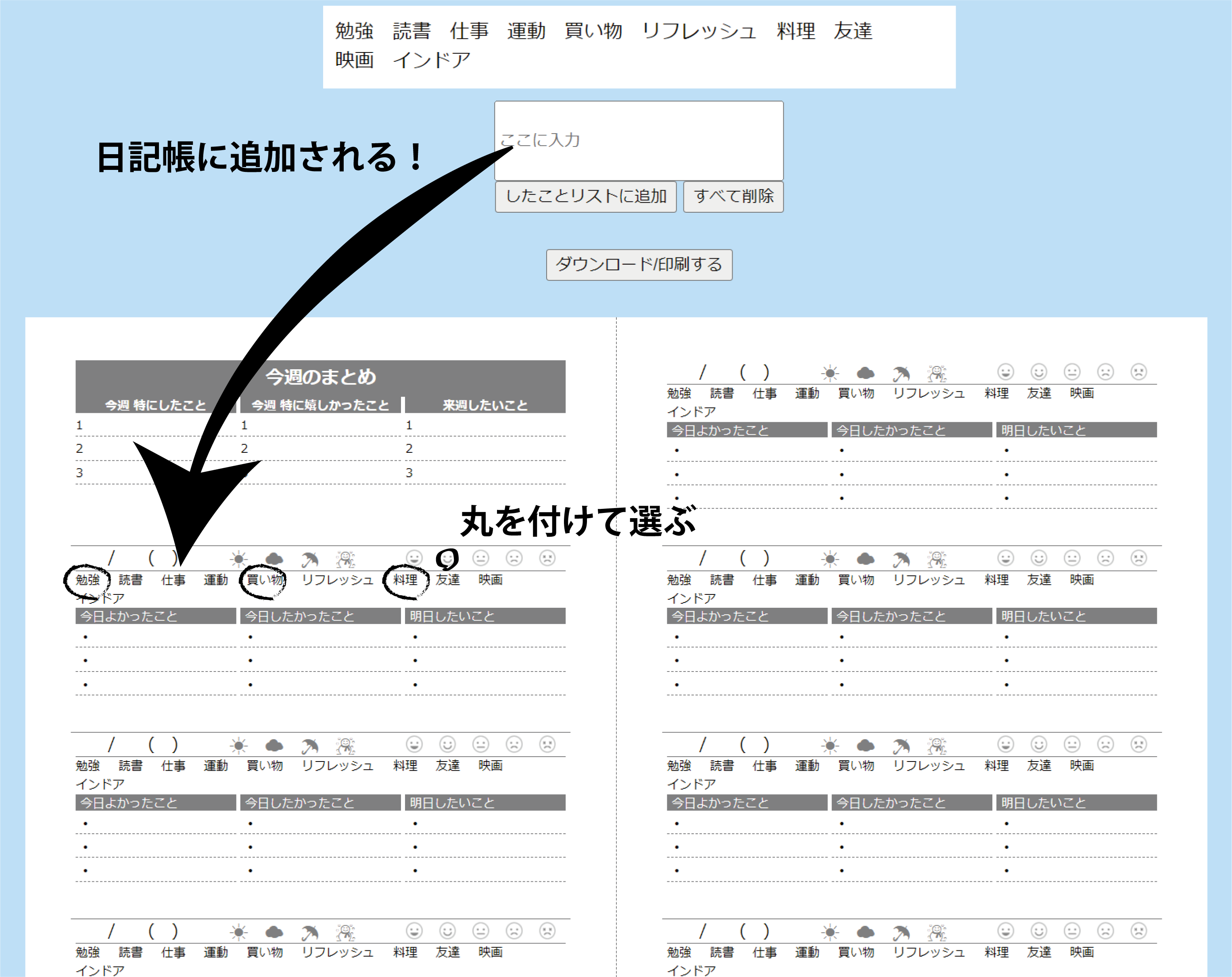 したことに〇をつけて簡単にその日の行動をまとめる事ができます。