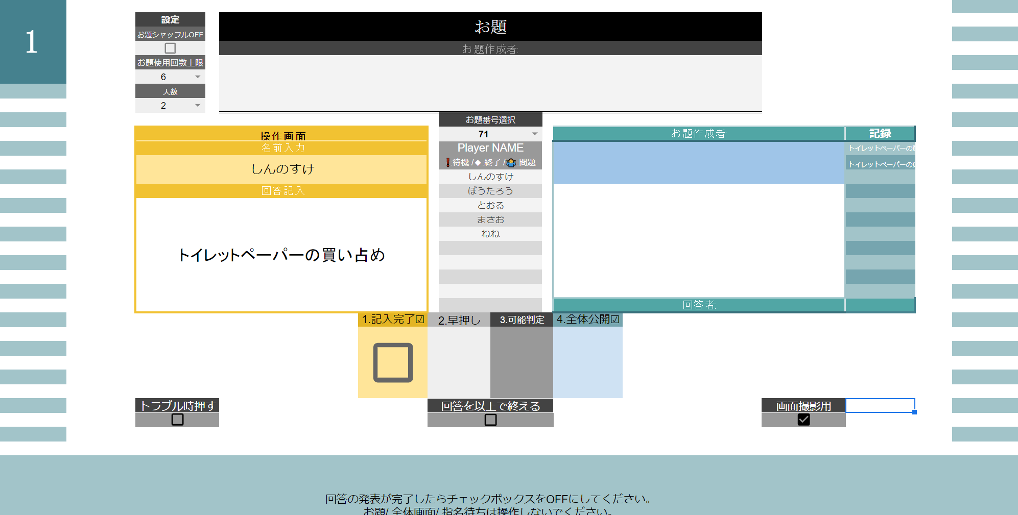 「回答ボタン」を非表示にすることで司会を要さずにあそべます。